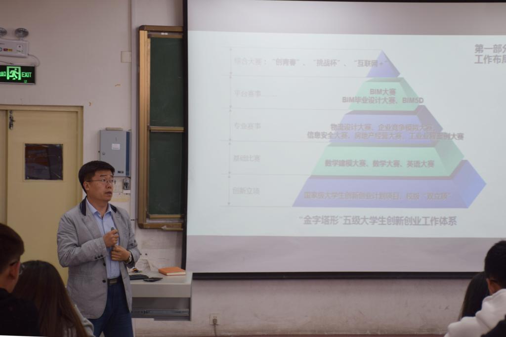 第二篇章,于利俊主要讲述了管理工程学院的科技创新和学科竞赛发展路径和工作思路。于利俊首先介绍了管理工程学院“金字塔”五级大学生创新创业工作体系,分别是创新立项、基础比赛、专业赛事、平台赛事以及“创青春”等综合大赛。其次介绍了创新工作的思路方法,管理工程学院审时度势,统筹规划,构建“一二三四五六”工作机制:一个中心,两个抓手,三维辅导,四大平台,五大过程,六种机制,有力地促进了学院创新创业工作的发展。最后,于利俊全面深入地讲解数学建模、企业竞争模拟大赛、物流设计、BIM等八项大赛的参赛流程、比赛要求、获奖情况等信息,让新生对学院科技创新大赛和学科竞赛有了更为详细的了解,于利俊勉励大家树立创新意识,提高创新能力,为自己的未来发展奠定坚实的基础。