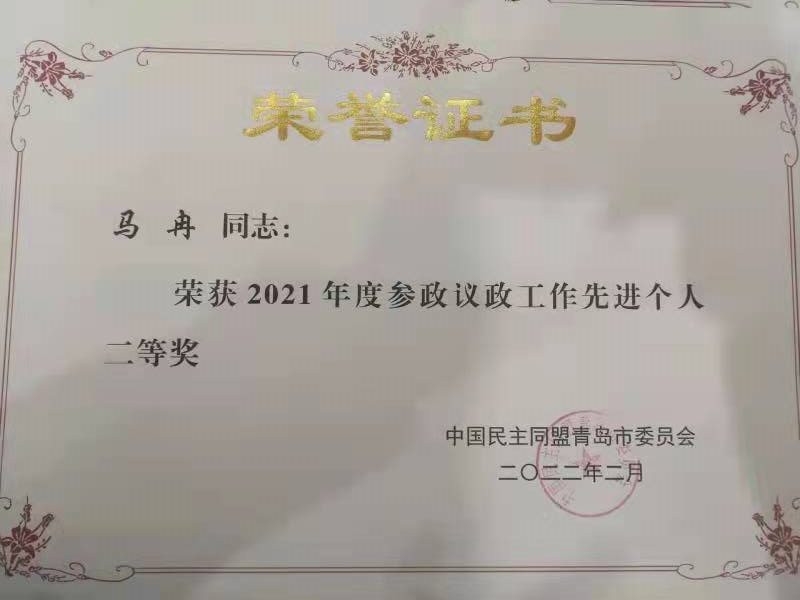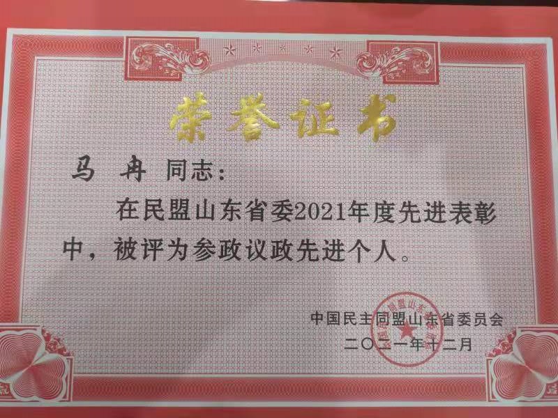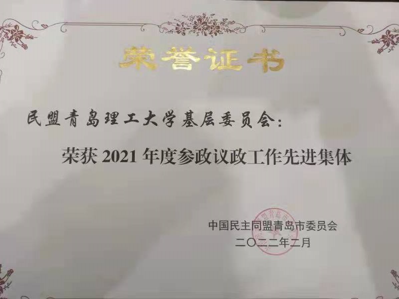 为树立典型、表彰先进,2月24日,民盟青岛市委召开了十四届二次全委(扩大)会议,对参政议政先进集体和先进个人给予表彰,民盟青岛理工大学基层委员会荣获“青岛市2021年度参政议政工作先进集体”,副主委马冉老师荣获“青岛市2021年度参政议政工作先进个人二等奖”和“山东省2021年度参政议政先进个人”荣誉称号。