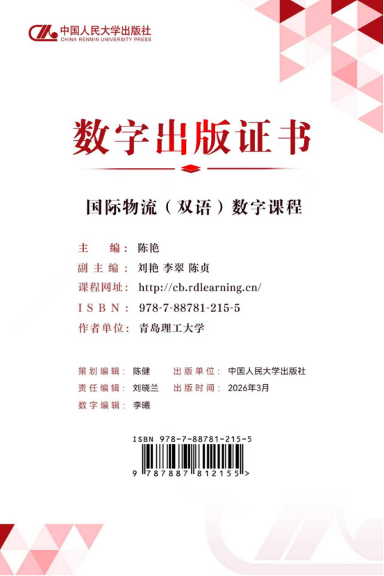 2026年3月,我院自主建设的精品数字课程——《国际物流(双语)》由中国人民大学出版社正式出版上线,标志着我院在数字教材建设领域取得标志性成果,为学院多元化教学模式改革与复合型专业人才培养注入新动能。
